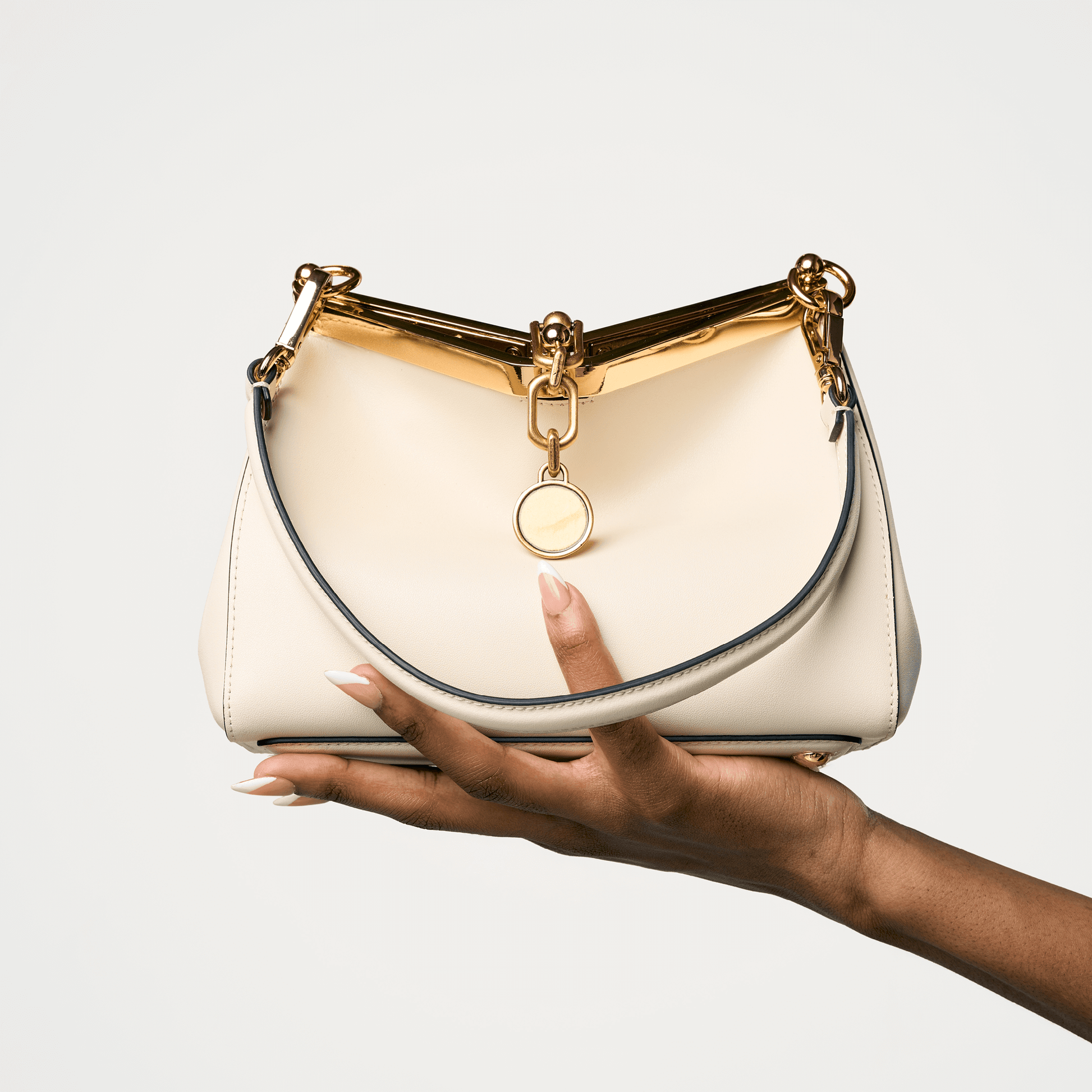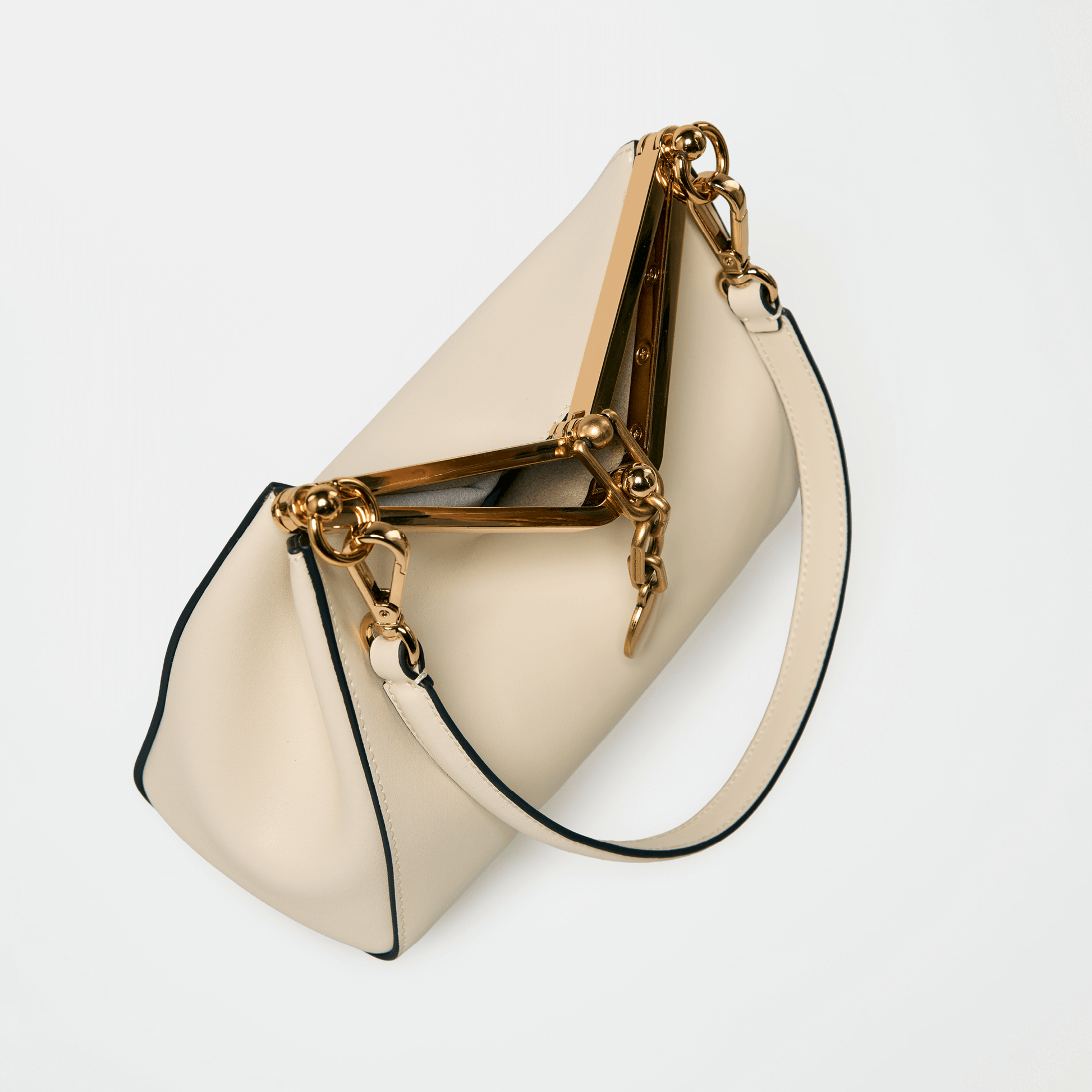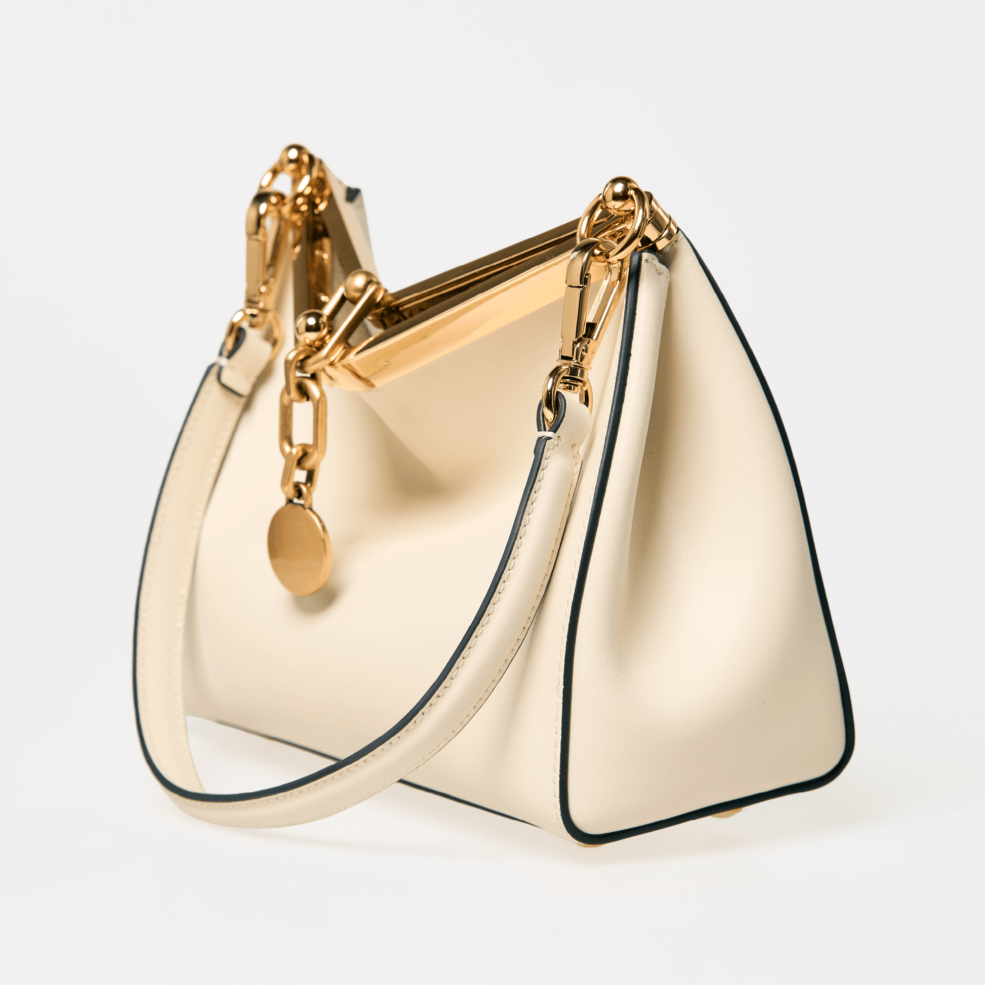 Crafted from smooth premium leather, the bag’s distinctive shape is both bold and timeless, making it a statement piece that transitions effortlessly from day to night. The structured metal top handle adds a jewellery-like finish, while the detachable strap allows for versatile styling carry it as a top-handle piece or wear it crossbody for a more relaxed look.