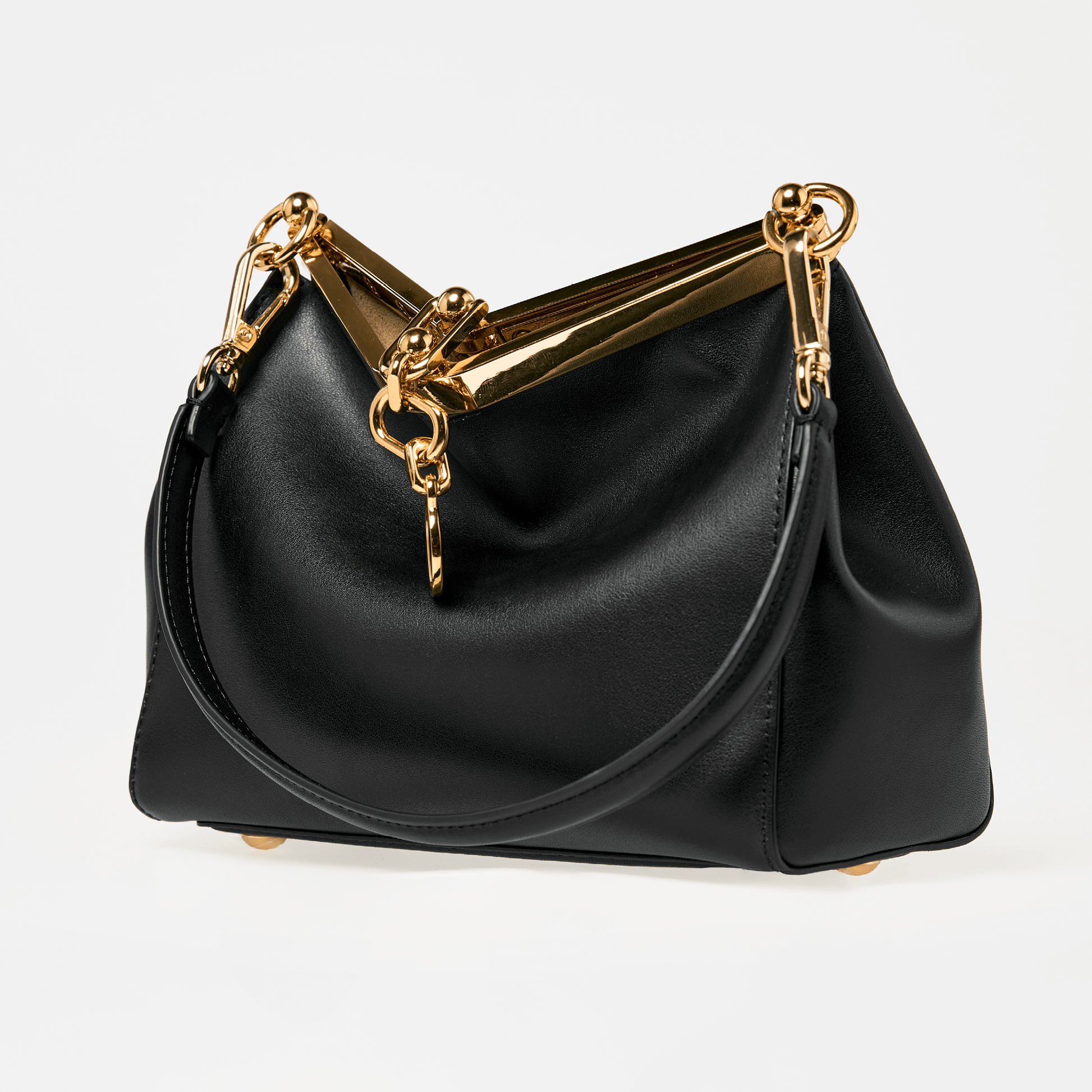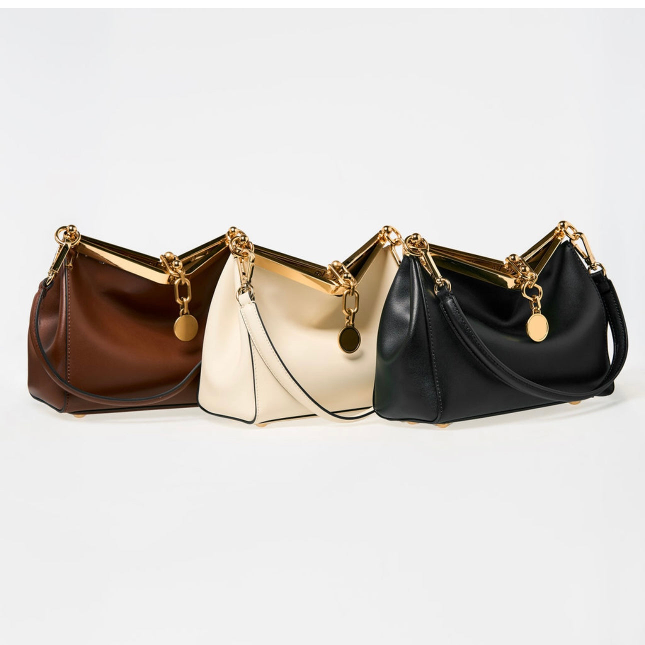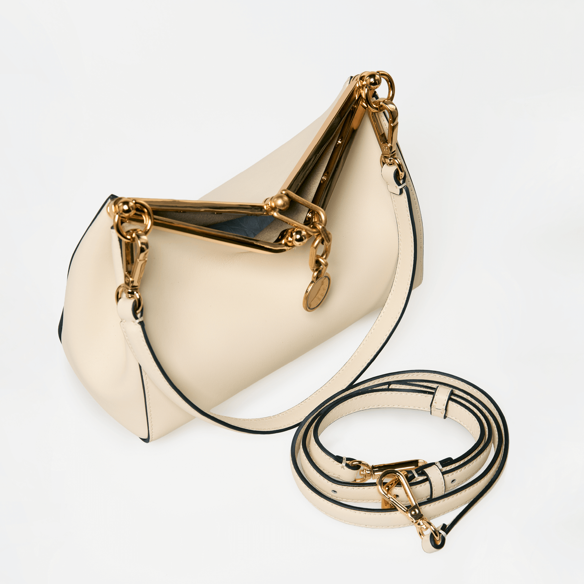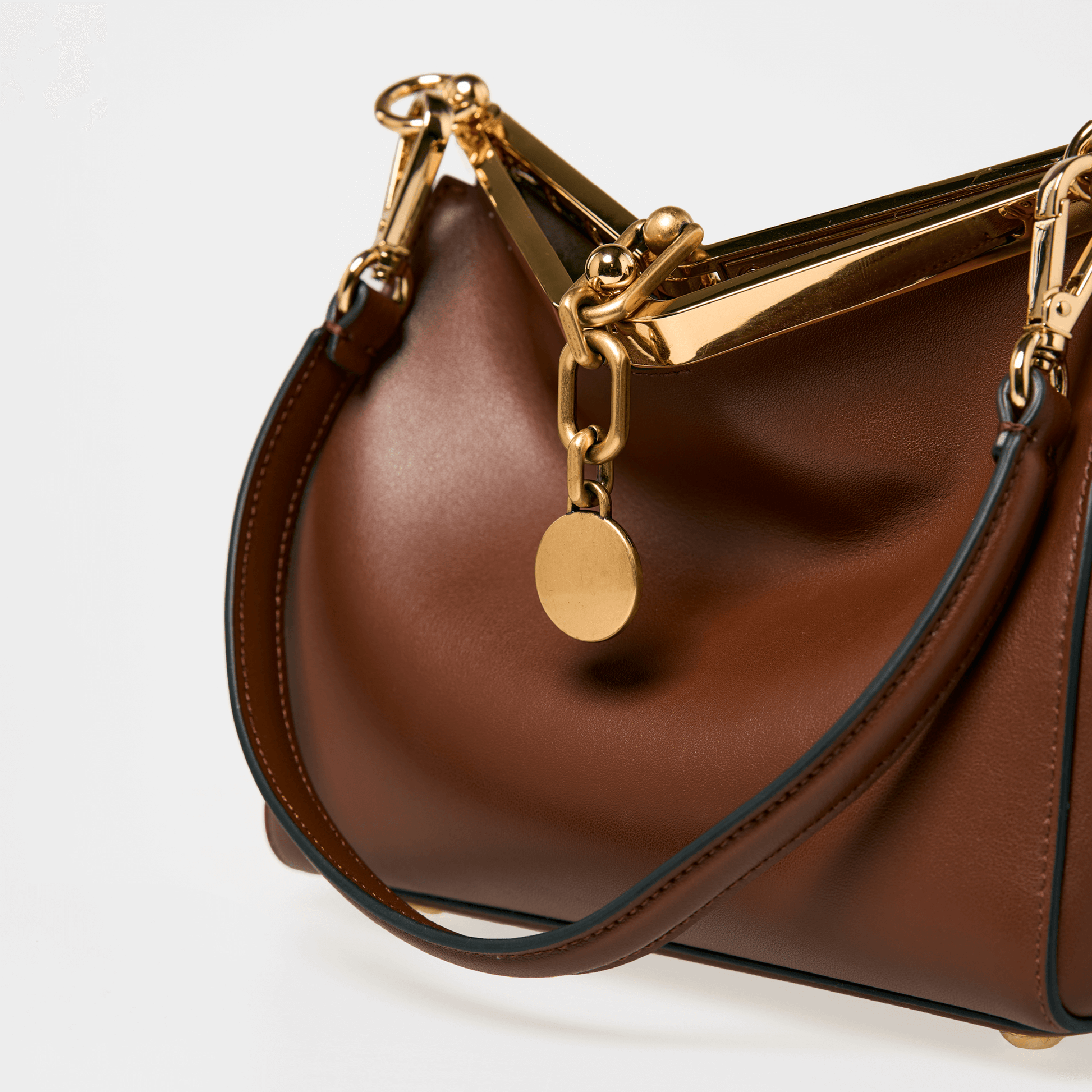 Crafted from smooth premium leather, the bag’s distinctive shape is both bold and timeless, making it a statement piece that transitions effortlessly from day to night. The structured metal top handle adds a jewellery-like finish, while the detachable strap allows for versatile styling carry it as a top-handle piece or wear it crossbody for a more relaxed look.